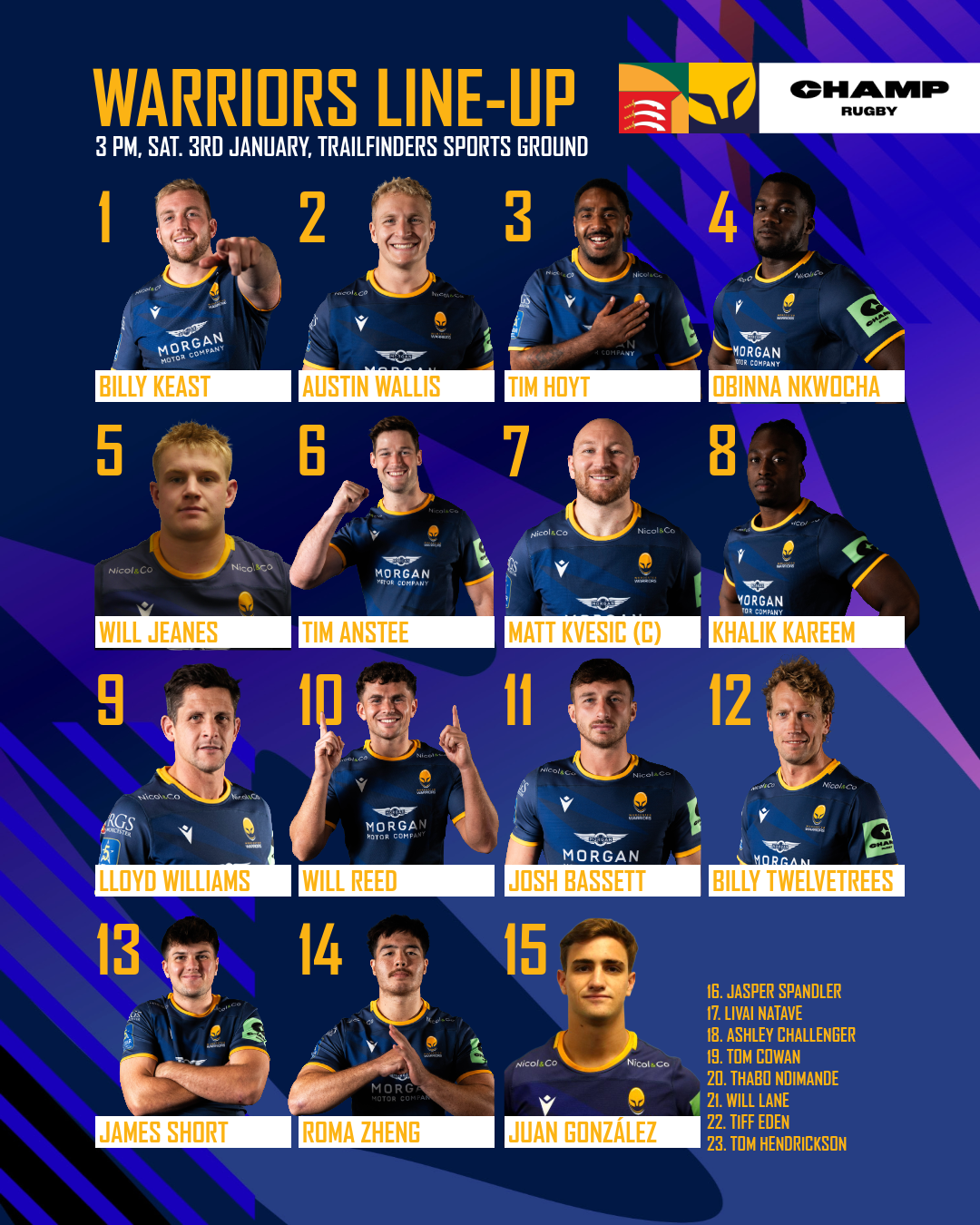 16 Jasper Spandler, 17 Livai Natave, 18 Ashley Challenger, 19 Tom Cowan, 20 Thabo Ndimande, 21 Will Lane, 22 Tiff Eden, 23 Tom Hendrickson