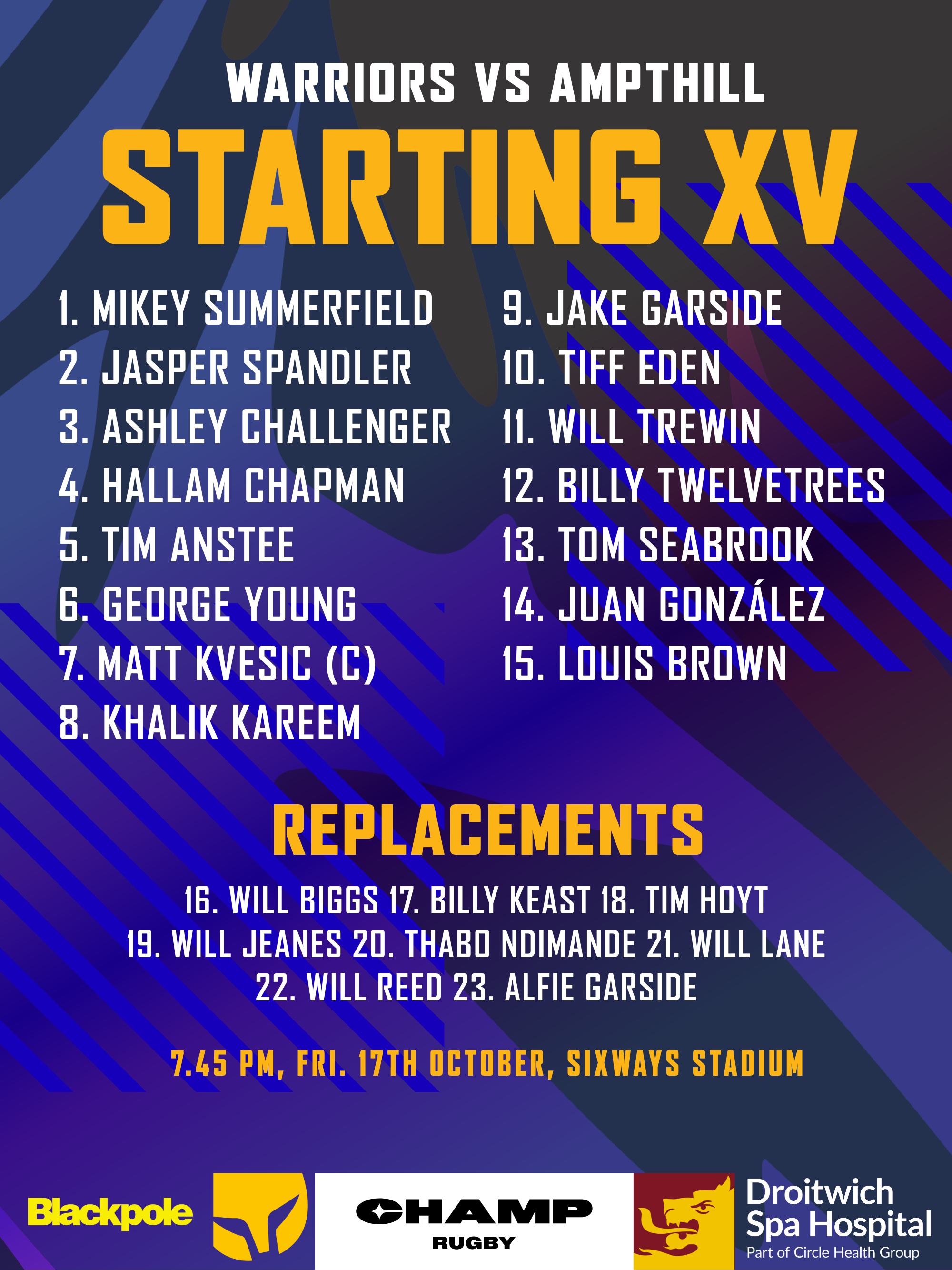 Warriors Team vs Ampthill (H – Champ Rugby Rd 3) – 7.45PM, Sixways Stadium