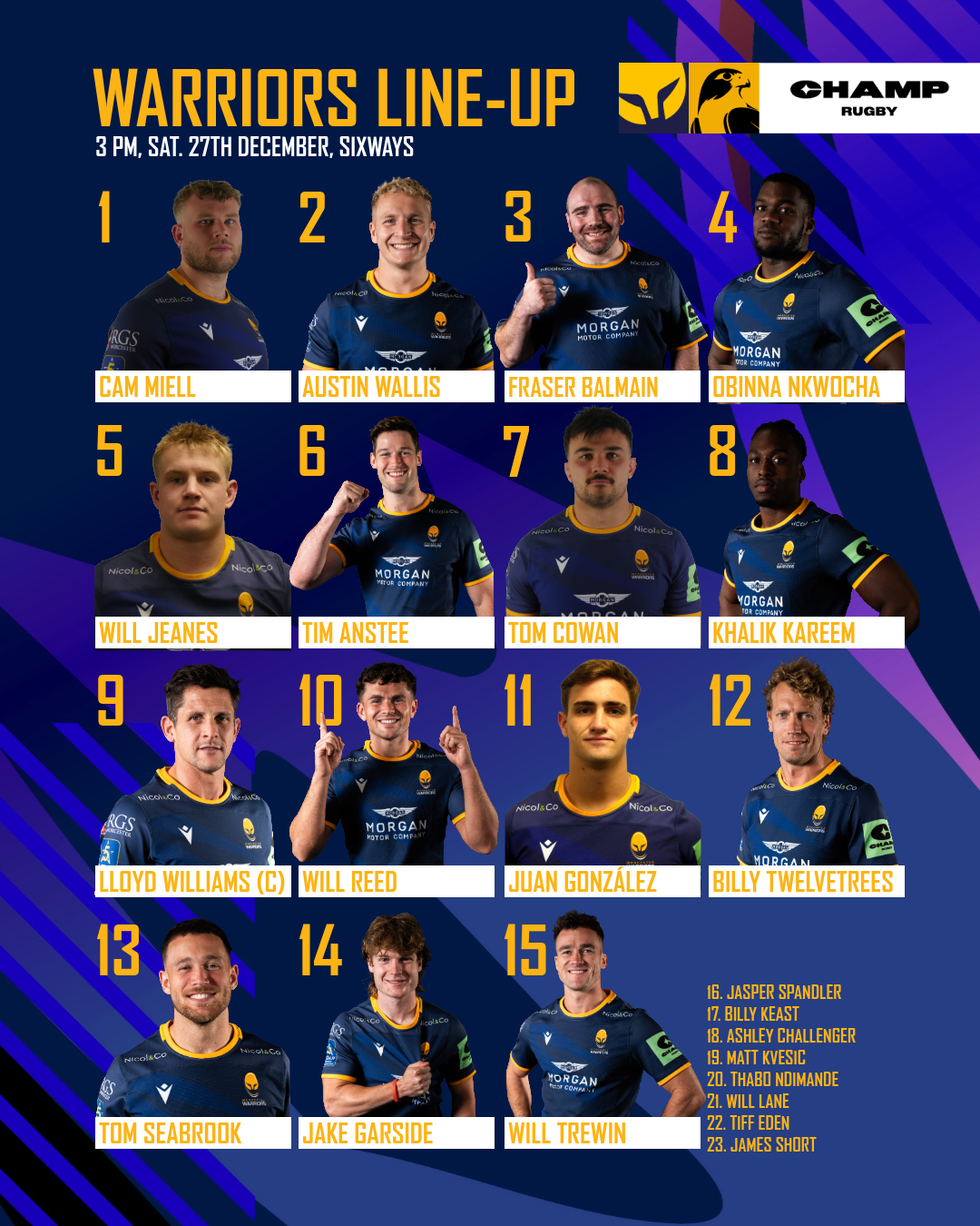 On the bench, Billy Keast and Matt Kvesic both return to the 23 where they’re joined by Jasper Spandler, Ashley Challenger, Thabo Ndimande, Will Lane, Tiff Eden and James Short.